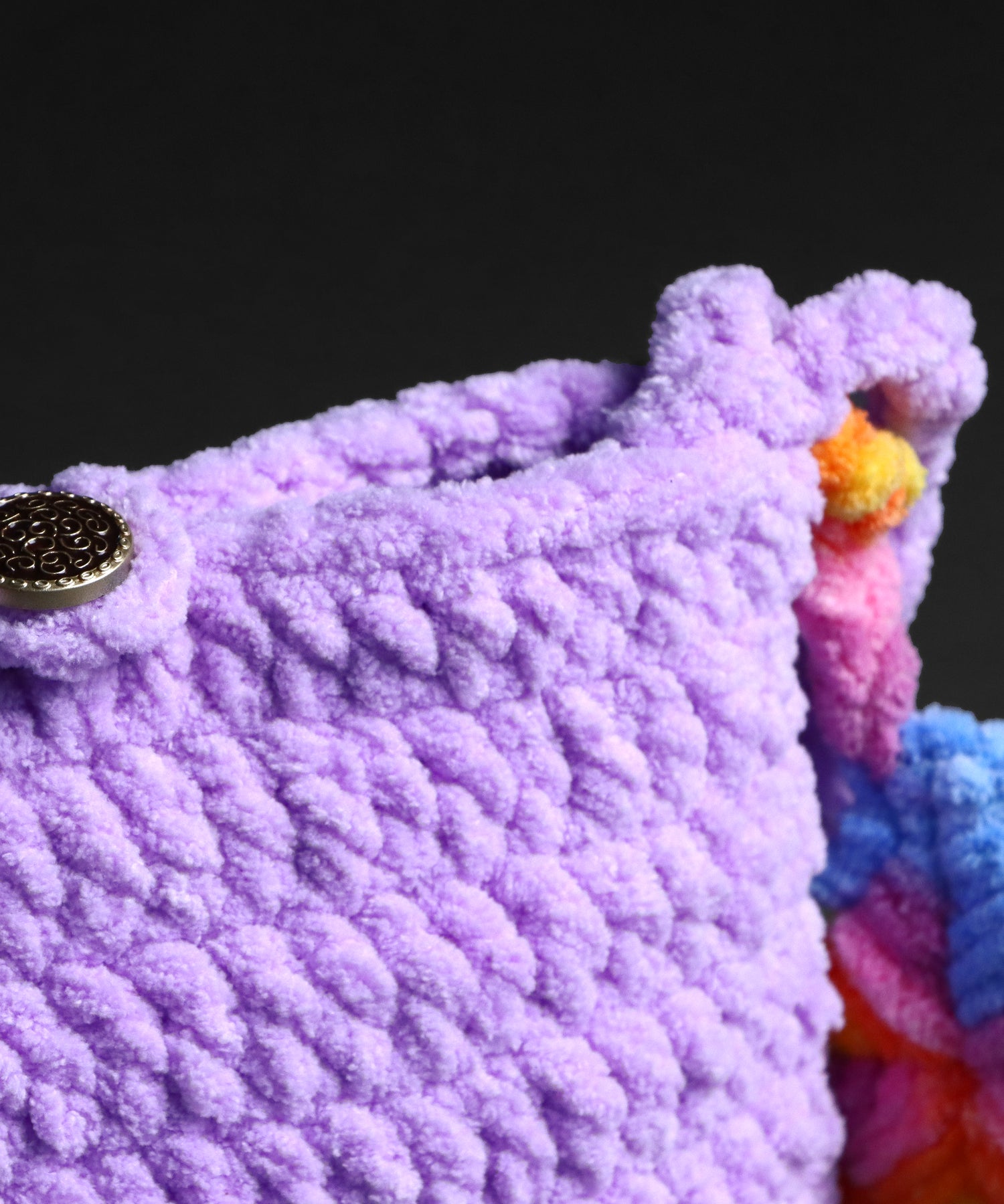 Bring a cozy pop of color to your outfit with this handmade crochet bag in soft lavender wool. Crafted with precision and care, this piece features a plush textured design and a colorful handcrafted accent on the side, adding a playful touch to its elegant form. Each bag takes hours of detailed handwork, making every piece truly one of a kind. Perfect for carrying your essentials in style, it’s a beautiful blend of comfort, craftsmanship, and creativity.