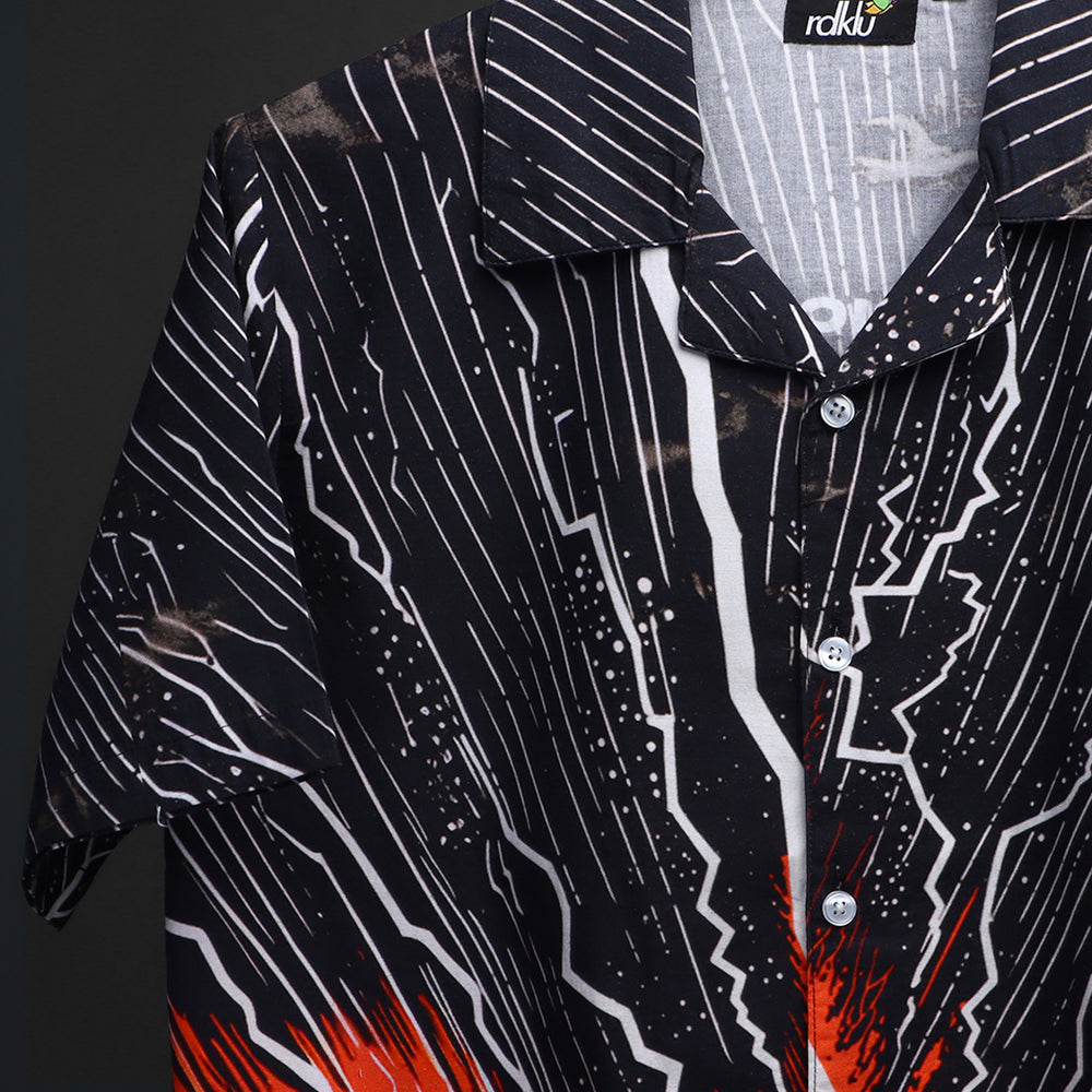 Strike with bold energy. The “Lightning Strike” shirt by RDKLU captures the raw power of nature with a high-voltage design featuring electric white bolts over a blazing red volcanic landscape. Crafted from pure cotton for breathable comfort, this shirt fuses dramatic visuals with a laid-back silhouette — perfect for late nights, loud music, and fearless self-expression.